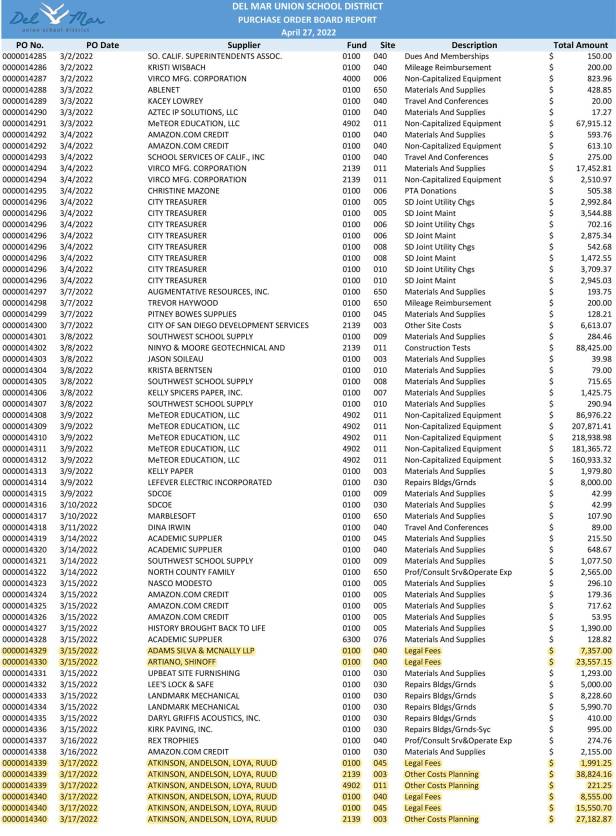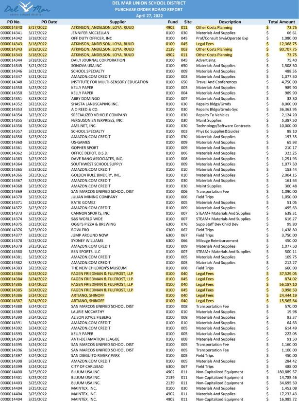 Budget/Expenses, Legal Fees Purchase order board report April 2022 Date: April 27, 2022Author: pureflamenco 0 Comments DMUSD reported $355,061.88 in legal fees for the month of March, 2022. Share this: Share on X (Opens in new window) X Share on Facebook (Opens in new window) Facebook Like Loading... Related