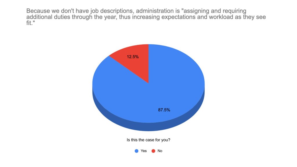 - We have no job descriptions which allows administration to keep assigning and requiring additional duties throughout the year, thus increasing expectations and workload as they see fit.