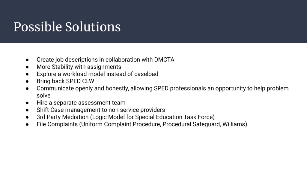 - When staff meet with administration to discuss their current workload and the impossibility to get everything done according to legal timelines, they are told they are not managing their time properly (in some cases threatened with an improvement plan, but then later changed to a summary of conference). Administration’s response to this is to sit down with the staff members and dictate what they should be doing (i.e what assessments they should be administering, what to include in their reports, and how to reschedule their day without the knowledge of what the position entails, etc.).