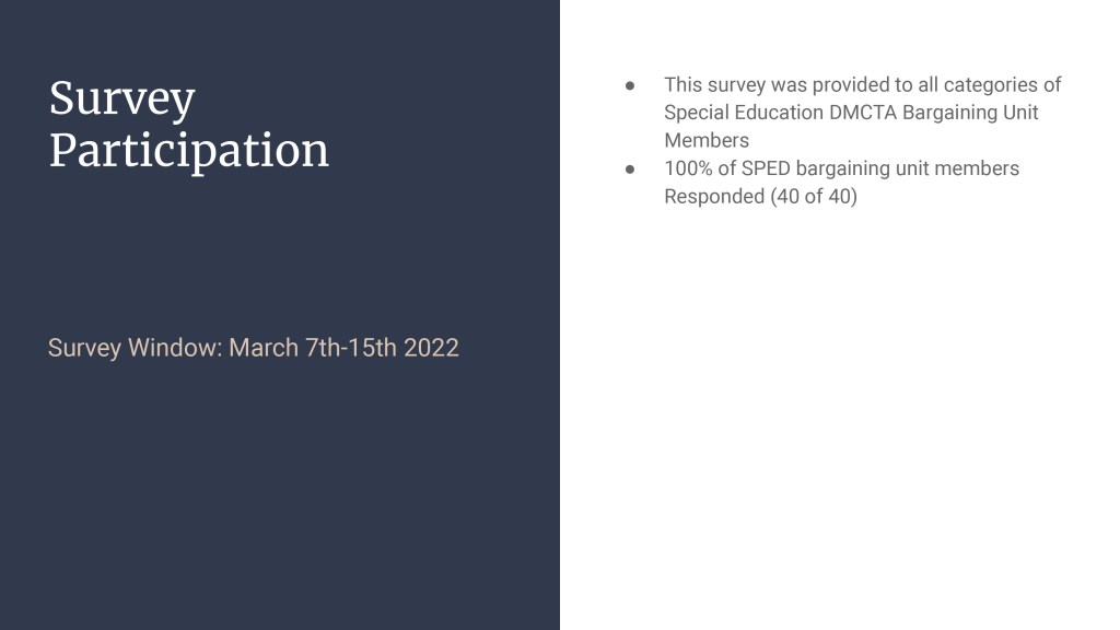 ● An anonymous survey to assess the current climate and health and wellbeing of personnel in special education positions (Special education staff have resigned in the greatest numbers of any two years and/or are under the care of physicians for job related stress. Mental health of special educators and morale is at an all time low).