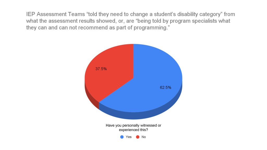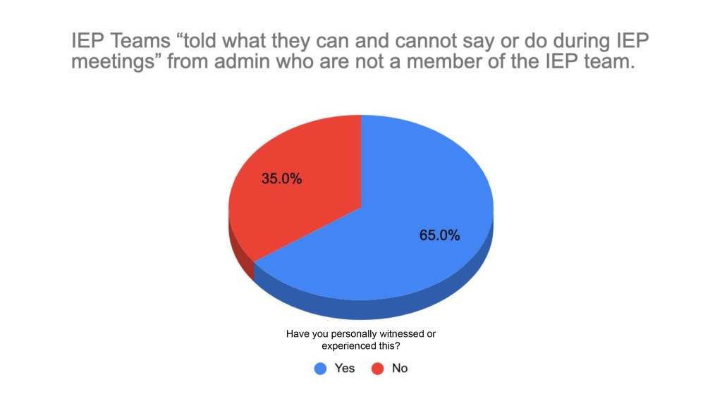 - IEP teams are being told by program specialists what they can and can not recommend as part of programming (i.e a less or more restrictive environment based on the student’s need).