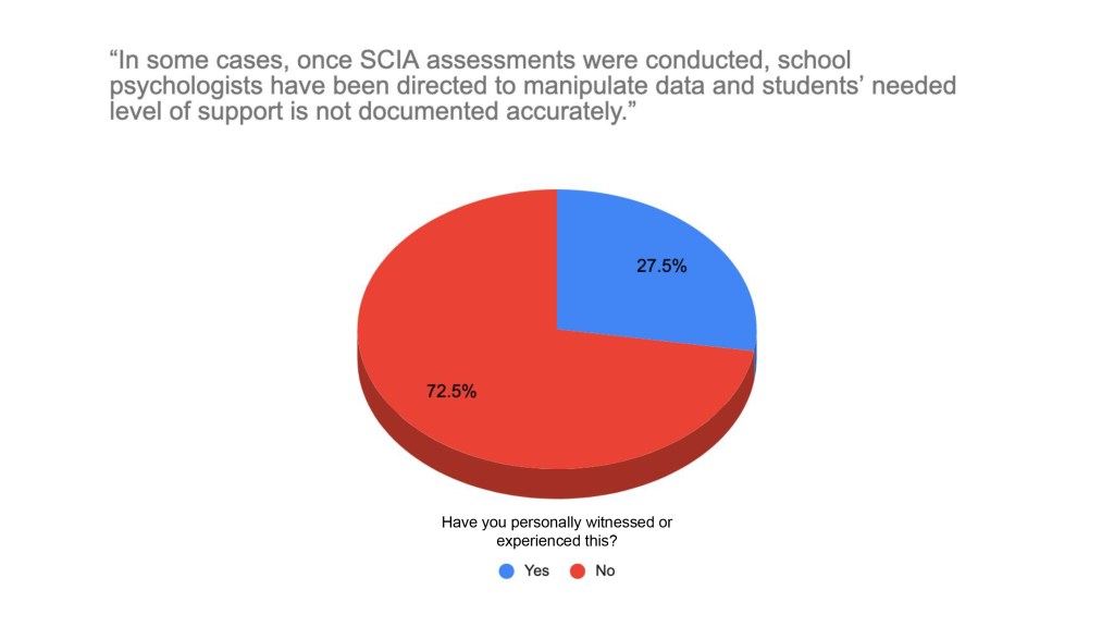 - In some cases, once SCIA assessments were conducted, school psychologists have been directed to manipulate data and students’ needed level of support is not documented accurately. This affects the safety and well-being of students and is not an accurate assessment related to the student’s level of need. Essentially the district is refusing to hire aide support and staff programs according to student need, per SCIA assessment.