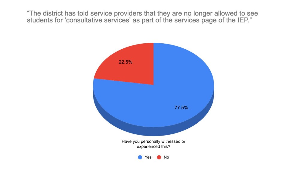 - The district has told service providers that they are no longer allowed to see students for “consultative services” as part of the services page of the IEP (therefore these students won’t count for a service provider’s caseload, yet service providers will still need to provide the services).