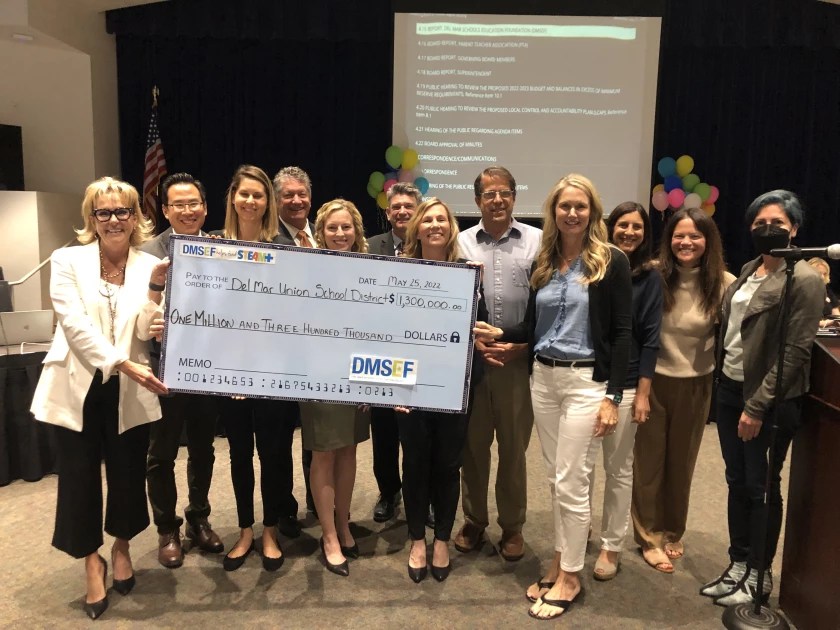 On behalf of the Del Mar Schools Education Foundation, Phoebe Katsell, 2021-2022 DMSEF president, presented the Del Mar Union School District with a check for $1.3 million at the May 25 Del Mar Union School District Governing Board of Trustees meeting.